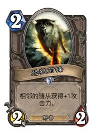 恐狼前锋:本来就是动物园构筑里的常青树,而且具有野兽属性,能配合火蝠和狼外婆解场,还能强化各种亡语的衍生物小怪。猎人这个职业补刀挺伤的,有时候就是因为对面的怪多出来的一血,你怎么打都不合算,尤其是现在萨满动不动就跳图腾魔像。而狼就给我们提供了一个很好的场面帮助,更有时对手怎么都想不到你会恐狼配放狗来一波,效果很酸爽。