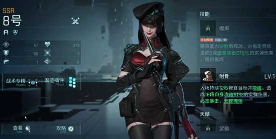 8号是镭明闪击中属性突出的刺客类角色,以高机动性和爆发著称。她的技能可对指定目标造成基础攻击倍率275%的伤害,分四段释放,具备良好的打断与压制效果。更重要的是,8号是目前游戏中唯一拥有隐身能力的角色,能够在战斗中实现战术规避或精准切入,非常适合需要灵活走位的操作型玩家使用。