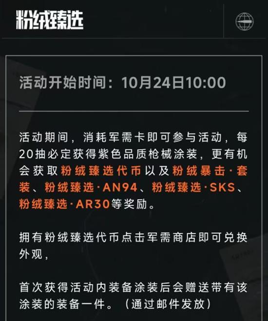 活动期间,消耗军需卡即可参与活动,每20抽必定获得紫色品质枪械涂装,更有机会获取粉绒臻选代币以及粉绒暴击·套装、粉绒臻选·AN94、粉绒臻选·SKS、粉绒臻选·AR30等奖励。