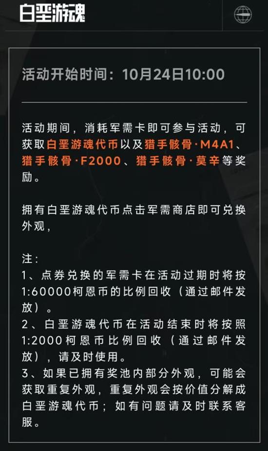 活动期间,消耗军需卡即可参与活动,可获取白垩游魂代币以及猎手骸骨·M4A1、猎手骸骨·F2000、猎手骸骨·莫辛等奖励。