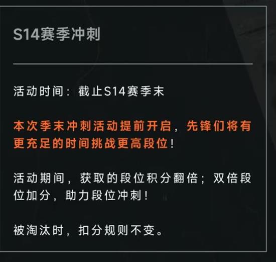 S14赛季冲刺:活动时间截止S14赛季末。本次季末冲刺活动提前开启,先锋们将有更充足的时间挑战更高段位!
