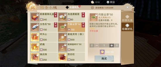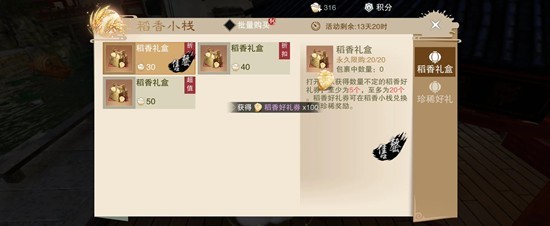 活动期间少侠们可以使用元宝购买稻香礼盒,开稻香礼盒将获得一定数量的稻香好礼券。使用稻香好礼券在稻香小栈中兑换星阵100抽礼包、自选茜栀膏、叩天心、武魂、思归石、竹影尘芽、五色石等多种超值稀有好礼!