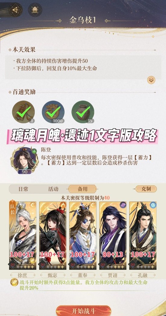 2. 我方每有1个密探普攻或者放大都会给陈登叠加1层【蓄力】,陈登身上会出现计数,叠满50层会秒杀我方全体密探,但是该配队打法在13回合前结束战斗无需考虑该问题