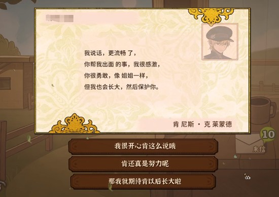 肯尼斯会通过寄信的方式与玩家进行情感交流。第一封信回复“真意外很开心”,第二封选择“期待”,第三封则回答“我也有很多景色想要和你分享”。这三段回应能有效增强彼此的情感连接。书信系统是火山的女儿中较为隐蔽但重要的好感机制,错过关键回复可能导致好感增长停滞。持续保持书信往来,并做出正确选择,是维系与肯尼斯关系的重要环节。