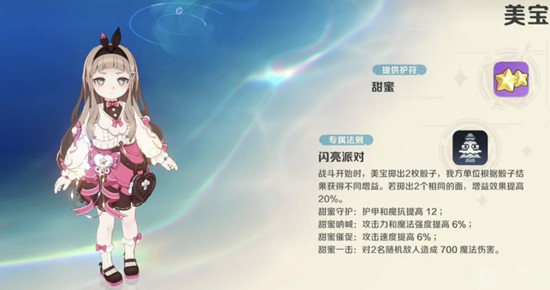 美宝在崩坏因缘精灵中定位为团队辅助型精灵,其核心技能“闪亮派对”具备开局自动触发的特性,能够为全队提供随机增益效果。该技能通过投掷两枚骰子决定增益类型,且每次战斗开始时必定发动一次。若两枚骰子点数相同,则所有触发的增益效果将额外提升20%,这一机制使得美宝在理想情况下能为队伍带来更强的加成,因此在追求稳定收益时,双同点数的出现成为关键因素。