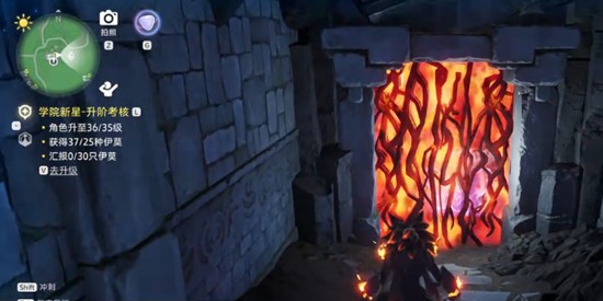 穿过荆棘后将进入一个小型密室,其中可拾取到一份勘探队的笔记。阅读内容可知,此地曾有探险队伍记录下地宫深处存在特殊宠物的信息。紧接着,前方另一扇门同样被荆棘封闭,再次使用小炭犬技能破除障碍。随后需完成一项能量收集任务,跟随漂浮的蓝色球型能量体依次触碰,即可激活后续通路。