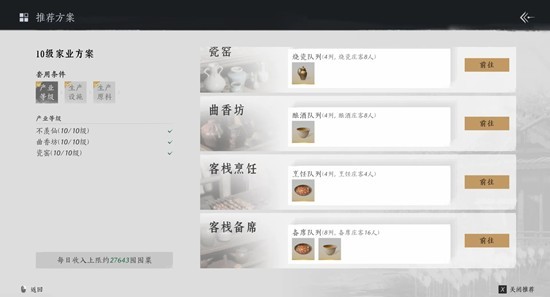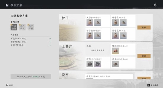 系统给出了各产业的推荐生产安排方案,并且给出了该方案的每日极限上限值,但是看P1我的昨日收入就能看出来,推荐方案其实收入并不是最高的(我的昨日收入为29313,推荐方案为27643,差了小两千)