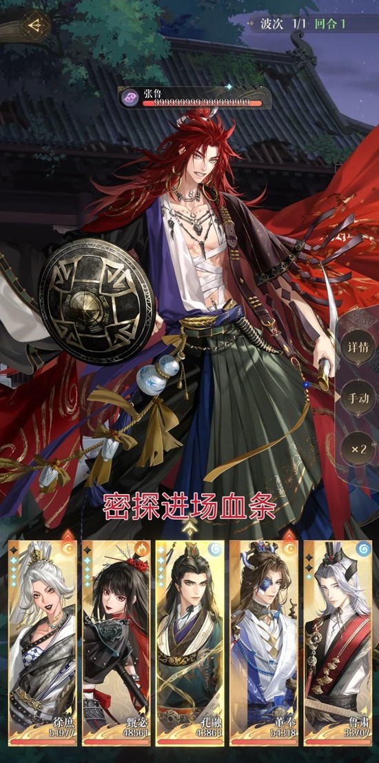 1. 这关张鲁不死亡无法打死张角,正常机制张鲁是9回合自动退场,但是我方密探站不住到9回合,因此使用鲁肃先把张鲁劝退,集体再打张角