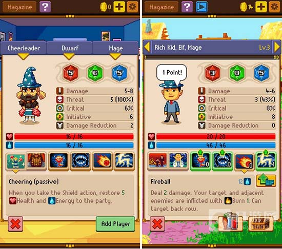 每次战斗可得经验值,经验值满可让角色升级,并可获得技能点数,强化每种职业的不同特色技能,比如魔法师的落雷与火球术等。在村庄中玩家还可在商店购买武器、盾牌等装备强化队员,基本上整体的架构设定相当复古。