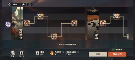 本次三国志幻想大陆2枭之歌韬略破阵共包含13个词条,全选后敌方将获得78%的攻击与血量增幅,并附加多项增益特性。词条搭配建议为:通用选择玄玄白,破敌选择右左右右,并肩选择右右右。该组合可在保证我方行动频率的同时,尽量压缩敌方优势空间。