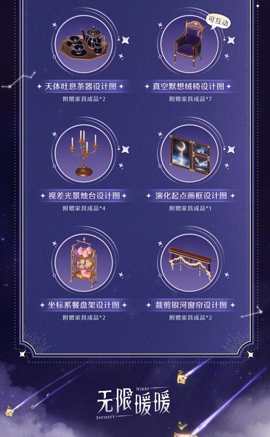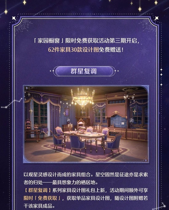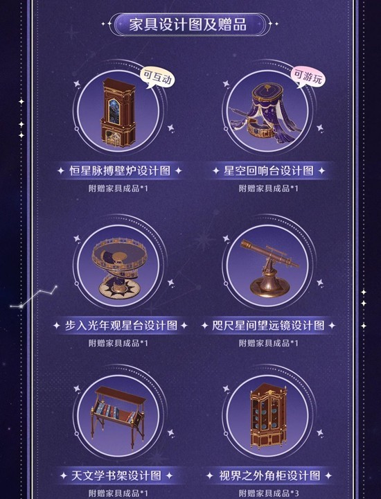 >>【群星复调】系列家具设计图礼包上新,活动期间额外可享限时「免费获取」,获取单品家具设计图,随设计图附赠若干该家具成品。