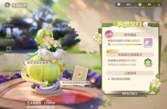 花费680无垠星石可签订【构想契约】,签订契约后,可直接领取全新家具【乐音守卫熊】及其家具设计图、获得更多乐园基石。