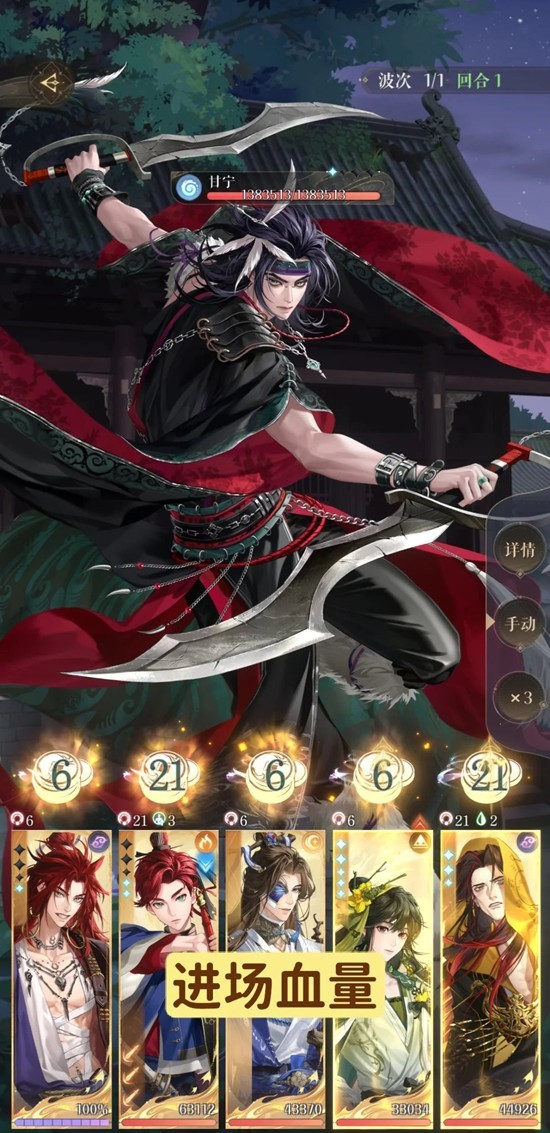 角复活会吸队伍中血量最高的那位密探,所以有时会吸权是因为权在那回合血量最高。因此要保证权挨完甘宁的平a后血量是低于董奉和戏学的,前几回合让角来回去吸他们两个。