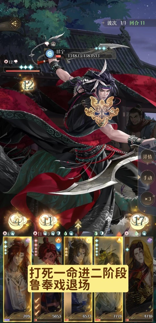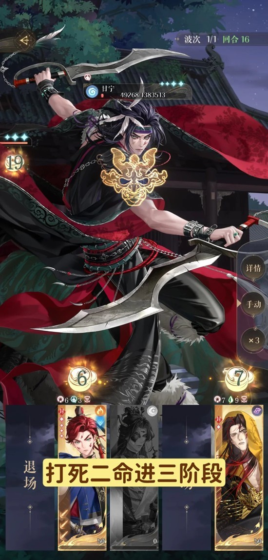16回合进入第三阶段,要留意权角头上的数字,谁数字多谁后行动(权是下拉,角是放大),最后25回合打完。