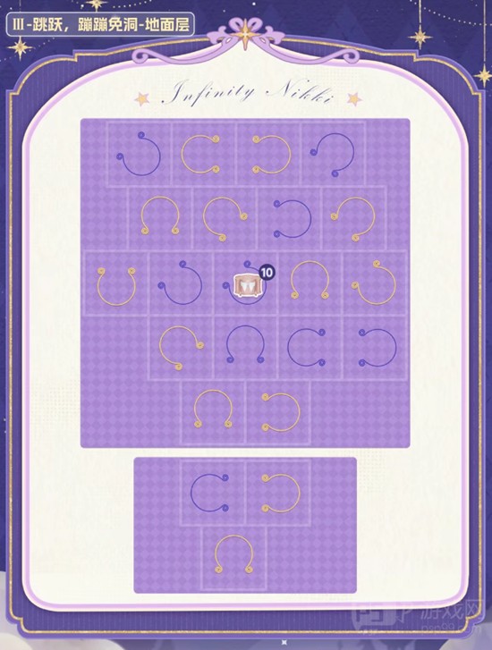 第三个迷宫主题为跳跃挑战,机制围绕“蹦蹦兔”展开。玩家需要利用特定平台进行跳跃移动,部分区域设有隐藏洞穴,但可通过跳跃绕过。宝箱位置设置在高台之上,需通过连续跳跃抵达,注意观察平台间的距离和落脚点。