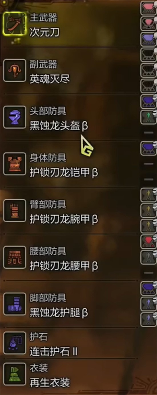 头部防具选用黑蚀龙头盔β,该装备提供稳定的会心率提升空间,并具备一定的防御补正。其插槽配置支持痛击珠与治愈珠的镶嵌,能够在维持输出节奏的同时略微提升生存能力。黑蚀龙系列头盔的技能兼容性较强,是过渡与终局阶段均可使用的优选部件。