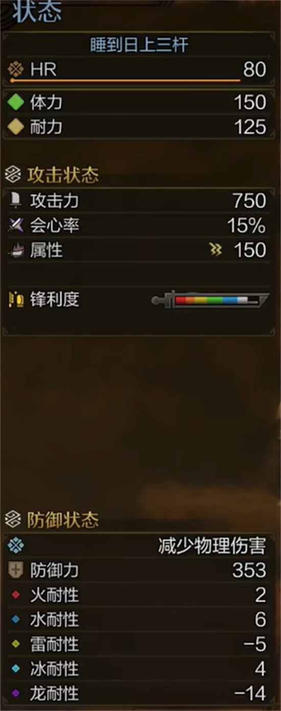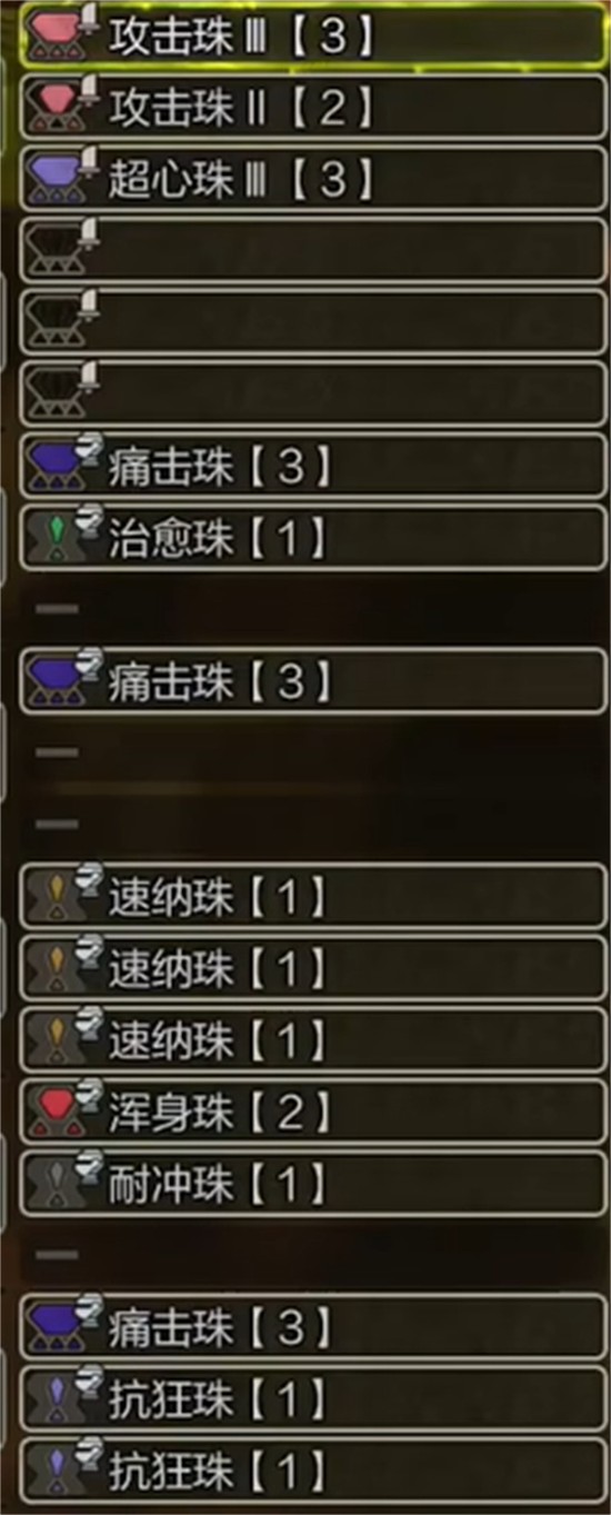 武器端镶嵌攻击珠III、攻击珠II与超心珠III,形成基础攻击强化与会心率提升的双重保障。攻击珠直接提升面板攻击力,超心珠则进一步拉高会心伤害倍率,配合太刀本身较高的会心补正系数,在触发暴击时能打出显著伤害,为麻痹积累创造更优条件。