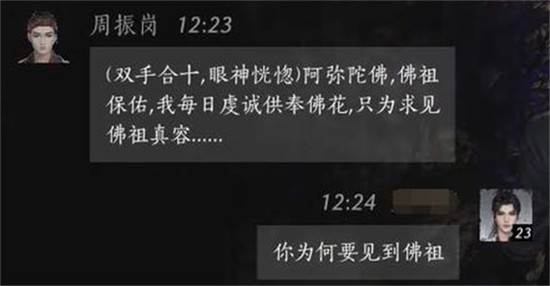 周振岗的位置在善妙洲左边的慈心镇,靠近一处民居旁。玩家需要主动靠近并与之互动才能开启对话流程。该任务采用一问一答的形式进行,每轮由玩家发言一次,系统自动推进周振岗的回应。整个对话过程不需要选择选项,而是按照固定语句依次输入即可完成。