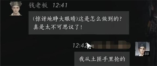 玩家在交付货物后,需选择回应“我从土匪手里抢的”这一句台词。这句话是预设的标准回答,能够正确衔接钱老板的反应并推动对话继续。若选择其他无关语句,可能导致对话中断或无法获得奖励内容。确保在对话界面中准确输入或选择该句,以保证流程顺利进行。