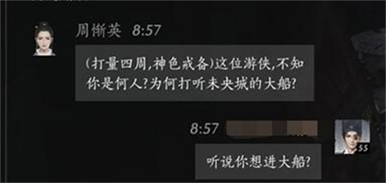 玩家在与周渐英互动时,首句应选择“听说你想进大船?”作为开场白。这句话会触发后续的对话选项,是进入该段聊天流程的关键起点。在燕云十六声中,NPC的对话往往依赖于玩家选择正确的引导语句,因此这一步不可跳过或替换为其他内容。