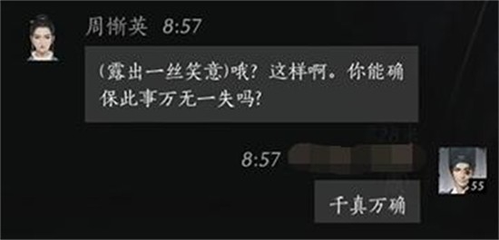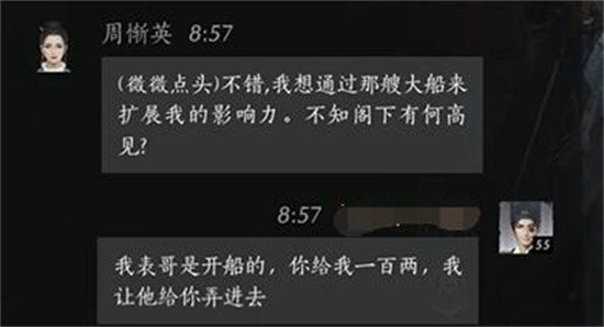 接下来的两句由玩家主动发起,系统不会提供选择,需手动输入或点击预设语句。“我表哥是开船的,你给我一百两,我让他给你弄进去。”这是第二句必须说出的对话内容。紧接着第三句为“千真万确。”,三句话依次说完后,整个与周渐英的聊天流程即告完成。这一系列对话构成了燕云十六声中该NPC互动的核心环节。