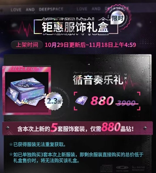 限时优惠,不容错过!10月29日更新后至11月18日上午4:59,「循音奏乐礼」钜惠服饰礼盒将以2.3折的超值优惠上架。仅需880晶钻,即可购入全部5套“我”的服饰套装,享受打包购买的折上折优惠。