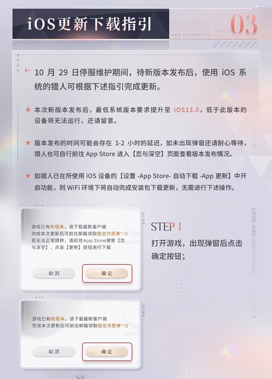 《恋与深空》新版本「直到心跳沸腾」将于10月29日正式上线!10月29日更新后,游戏客户端将进行强制更新,届时未更新的客户端将无法进入游戏。为保障游戏资源稳定,本次更新校验完成后,部分机型将会进入预热阶段。那么如何进行客户端更新呢?小编为你准备了一份攻略,一起来看看吧~