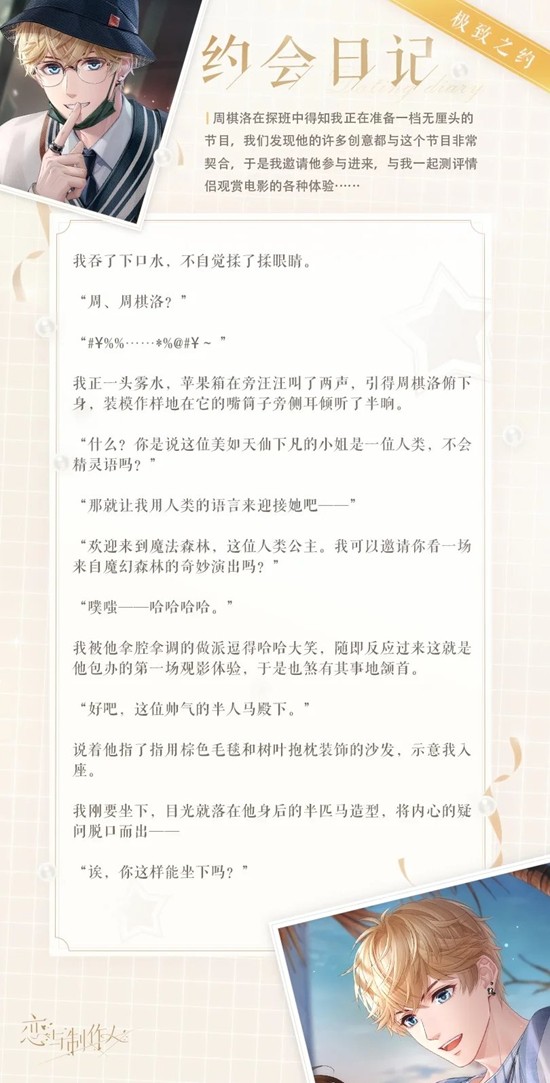 恋与制作人累充限定SR周棋洛 · 留白叙事10月28日上线~10月28日~11月7日,累计充值满68元,领取含限定SR【周棋洛·留白叙事】在内的多种道具好礼!炫酷的魔法森林场,惬意的海边露天场,更有普通人周棋洛为你随时准备的,精彩的每一场。一起来和小编看看吧~