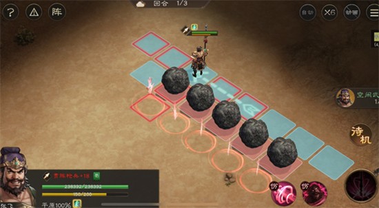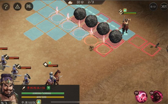 第三回合务必使用2技能触发中间巨石。经过多次测试验证,若在此阶段使用大招攻击中央巨石,虽可造成范围伤害,但无法补足剩余伤害,会导致至少一名敌方步兵存活。而2技能具备特殊的联动机制,能够在推动巨石的同时对全体敌人附加额外打击效果,恰好弥补输出缺口,实现完美清场。
