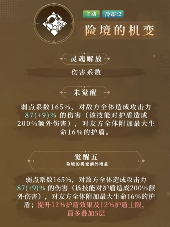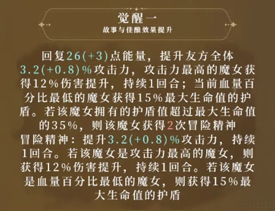 若该护盾数值超过目标最大生命值的35%,则该单位还会额外获得一层3.2%基础攻击倍率的攻击力加成。觉醒后,此增益效果可触发两次,两层buff可叠加。攻击力最高且生命值最低的角色有机会重复获取加成,最高可达40%的伤害提升,极大增强了关键输出位的爆发能力。