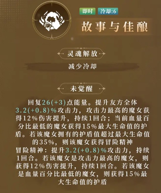 花梨的大招技能名为故事与佳酿,主要功能是能量恢复与团队增益。未觉醒时,释放该技能可恢复自身26点能量,并提升全体友方3.2%的攻击力。其中攻击力最高的单位额外获得12%的伤害加成,持续一个回合。同时,技能会为当前生命值最低的队友提供相当于花梨最大生命值15%的护盾。
