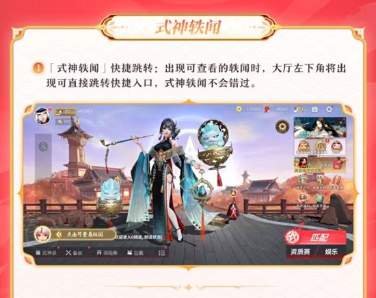 式神轶闻快捷跳转:当出现可查看的轶闻时,大厅左下角将出现可直接跳转快捷入口,玩家可以轻松进入式神轶闻,不会错过任何轶闻内容。