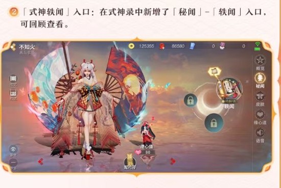 式神轶闻入口:在式神录中新增了「秘闻」-「轶闻」入口,玩家可以通过这个入口回顾查看已解锁的式神轶闻。