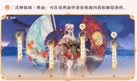 式神轶闻界面:在这个界面中,玩家可以查看轶闻内容和解锁条件,了解式神的更多故事。