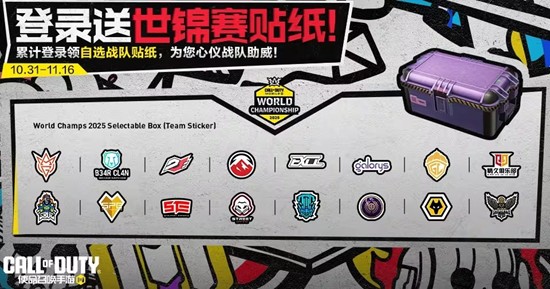 世锦赛即将开战,战士们准备好了吗?反正瘦普的福利已经就位。10月31日(本周五),世锦赛累登礼上线,战士们累计登录,就能获得战队贴纸自选宝箱。