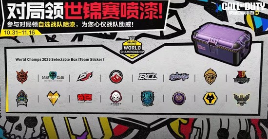除了贴纸,战队喷漆也少不了。10月31日(本周五),世锦赛对战礼活动开启,战士们参与任意对局,即可领取战队喷漆自选宝箱。