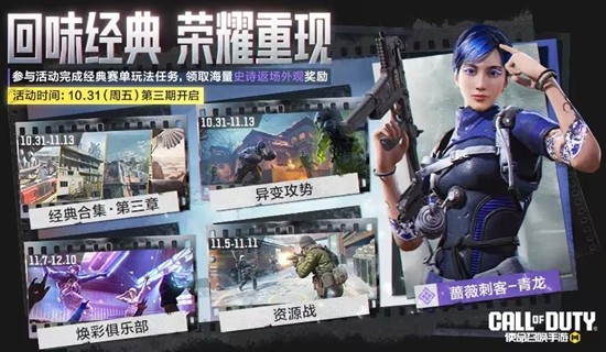 10月31日(本周五),2022怀旧地图合集经典回归,战士们参与活动完成经典玩法任务,领取蔷薇刺客-青龙等海量史诗返场外观奖励啦!