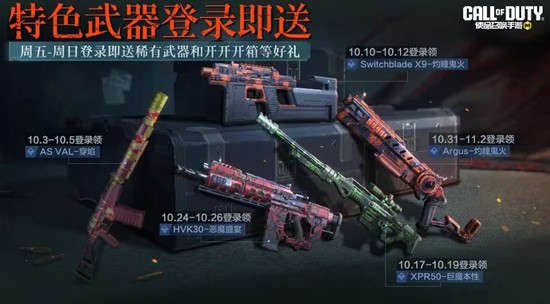 10月31日(本周五),周末登录礼活动再度开启。战士们周末登录游戏,就能获得稀有级武器Argus-灼瞳鬼火、开开开箱和福利点券。