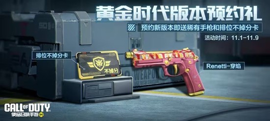 新版本即将到来,预约正式开启。11月1日(本周六),新版本预约礼上线,战士们预约新版本,就能领取Renetti-穿焰、排位不掉分卡和开开开箱哟~