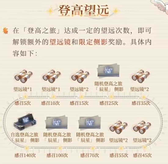 在“登高之旅”中,玩家达成一定的望远次数,即可解锁额外的望远镜和限定侧影奖励。具体奖励包括:
