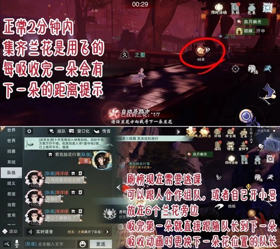 ②逃课可以跟人合作组队或者开小号(图3),第一个从自己开始,把号放在后6个兰花旁边,吸完第一朵就直接跟随队长到下一朵