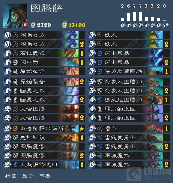 这里先插一点点题外话,之前营地对于卡组分类的讨论很深入,而我自己的观点更倾向于:快攻Aggro/Face,中速Mid-range,控制Control,这勉强可以算是从对局平均时长的角度由快至慢的划分,但还有节奏Tempo,组合技Combo,单回合杀OTK,这些以卡组核心要素命名而又难以强行与前者对应的存在。更别提很多时候实际卡组是多种速率、要素的混合。其中这里想尤其讲的是龙王Kibler的一个提法我觉得很对,天梯主流T1的龙战、中速猎常常被认为是“节奏”卡组,这是不对的,满费派人、靠曲线质量和牌序碾压的思路应该只能叫“中速”,而代表性的节奏卡组是盗贼和节奏(火妖)法,在特定回合利用优质生物、异能和低费法术实现返场站场,利用寥寥一二个回合内的节奏优势迅速奠定胜势,我想有涉猎这些卡组的朋友应该能觉察出这其中巨大的差别。本套图腾萨就很符合这个定义。