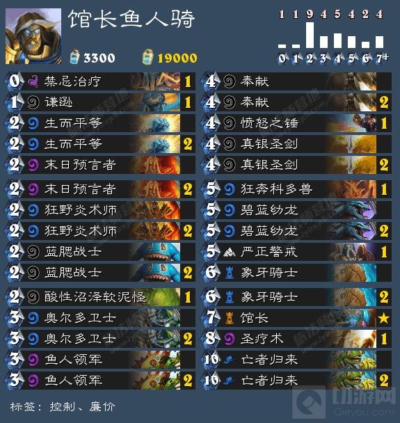 那么这次先带来的是三套我比较感兴趣、目前花了最多时间测试改动的卡组。一眼看去,一个比一个便宜有没有!本套就是三套里最贵的了也不过三千来尘,唯一橙卡来自新冒险模式,有些比较贵的紫卡我们也只带了一张。然后残酷&不幸的现实就是这三套也是按从弱到强、从慢到快的顺序排列的,本套就是本文最弱卡组了。鱼人骑作为赢一把半年输一把两分钟的最强代表,可是有大数据支撑的(古神版本单局时长以及高频单卡统计),笔者上个月在这个卡组上花费了大量时间的结果是成功从5级攀升至3级满星后又掉回5级,怒弃卡组。但是他弱归弱,到底有多弱?有没有那么一点强的地方、一点变强的可能,或者至少一点乐趣和新意?