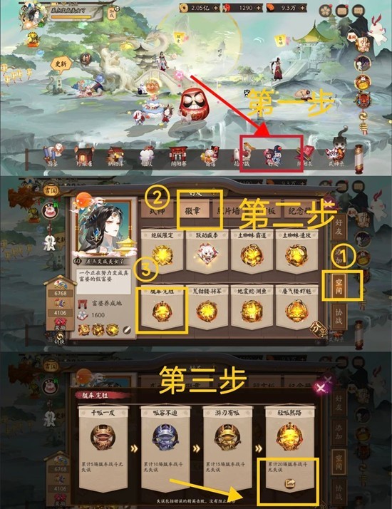 第二步点击空间——徽章——胧车完胜——分享——获得勾玉