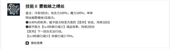 该技能拥有三回合冷却时间,基础伤害达到攻击力和魔力值的100%,同样作用于单一目标。释放时会喷出烟雾缠绕敌人,有40%概率使其进入变异状态——即被包裹成茧,在接下来的一个回合内无法行动。若未能触发茧化效果,仍会对防御最低的敌方单位施加70%的防御削减,该减益持续两个回合。此技能在配合队伍集中火力时能显著提升整体输出效率,是内布拉核心功能性之一。
