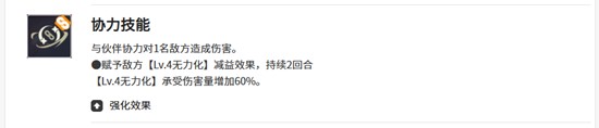 她的协力技能需要与其他角色联动才能触发,虽然造成的直接伤害不高,但可使目标陷入无力化状态,令其受到的伤害提升60%,持续两回合。这一减益效果虽不依赖概率,但需合理安排出场顺序与协作对象才能稳定发挥。因此,在搭配队友时应优先选择行动节奏匹配、输出频率高的角色,以最大化无力化的覆盖时间。