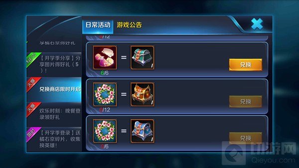 欢乐花环可以兑换东西,6个欢乐花环=铭文碎片x20(有几率开出2倍或者5倍的暴击),12个欢乐花环=铭文碎片20+钻石x20