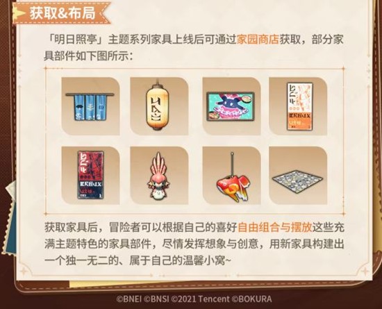 冒险者可以通过家园商店获取「明日照亭」主题系列家具。获取家具后,冒险者可以根据自己的喜好自由组合与摆放这些充满主题特色的家具部件,尽情发挥想象与创意。