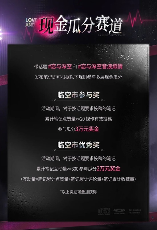 赛道一:带#恋与深空 和#恋与深空音浪燃情 双Tag,并发布与恋与深空新版本内容相关的笔记,有机会参与多层现金瓜分!