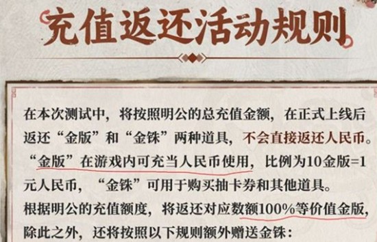 充值1元可获得10个金版和10个金铢。金版在正式服中可当作人民币使用,能购买月卡、礼包等标价人民币的商品,相当于全额返还充值本金。金铢主要用于购买抽卡券或游戏道具,帮助玩家囤积抽卡资源。